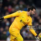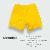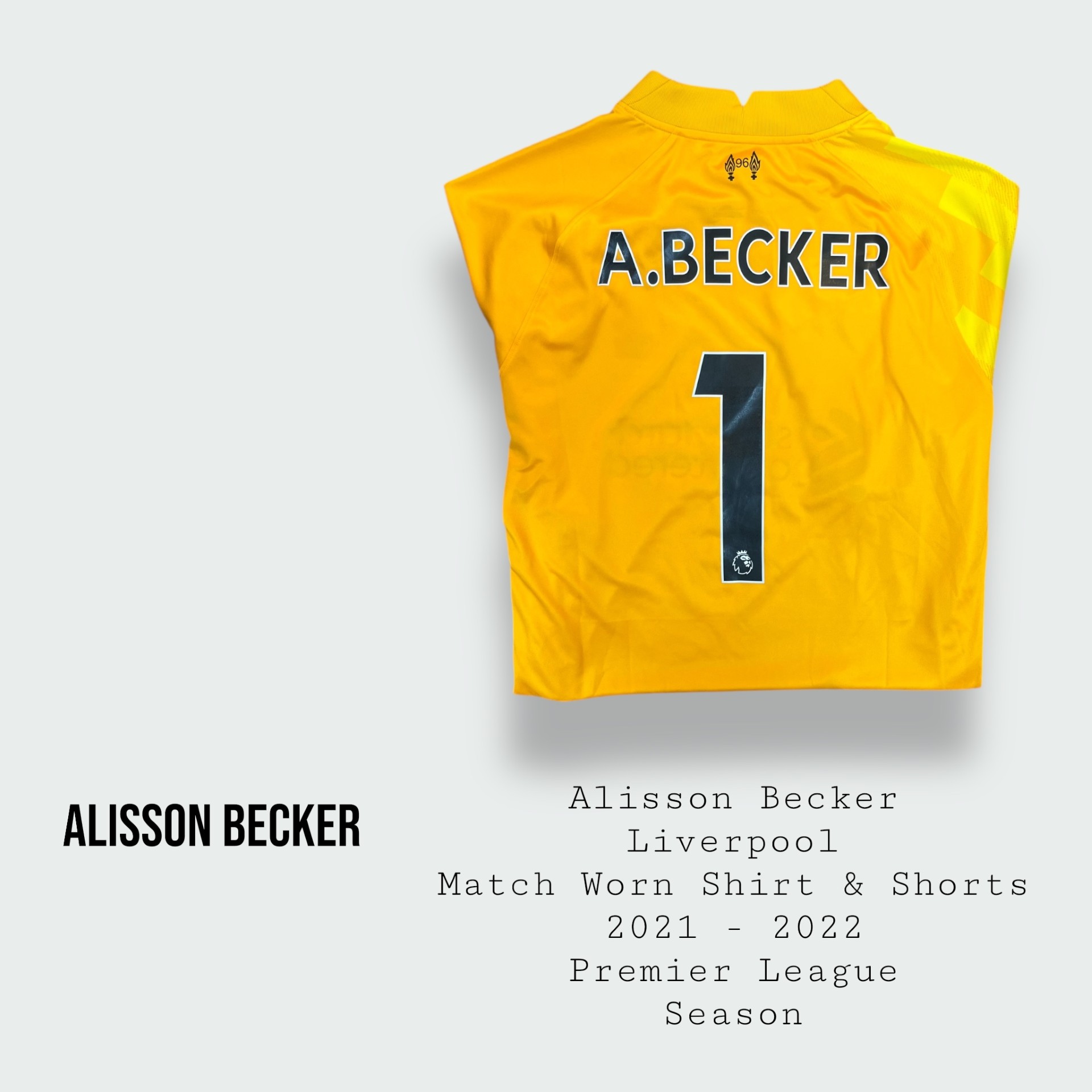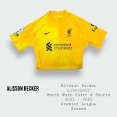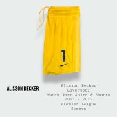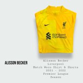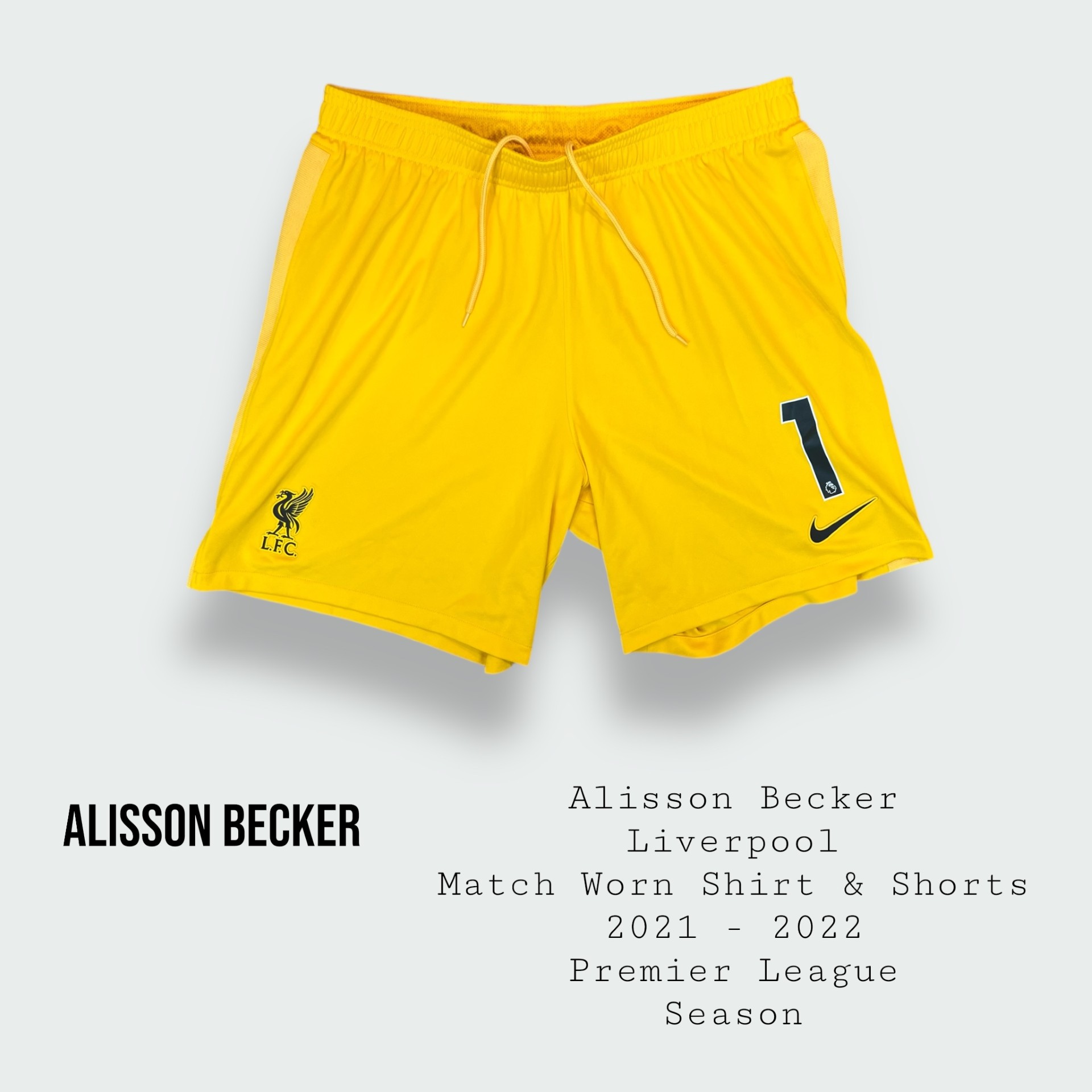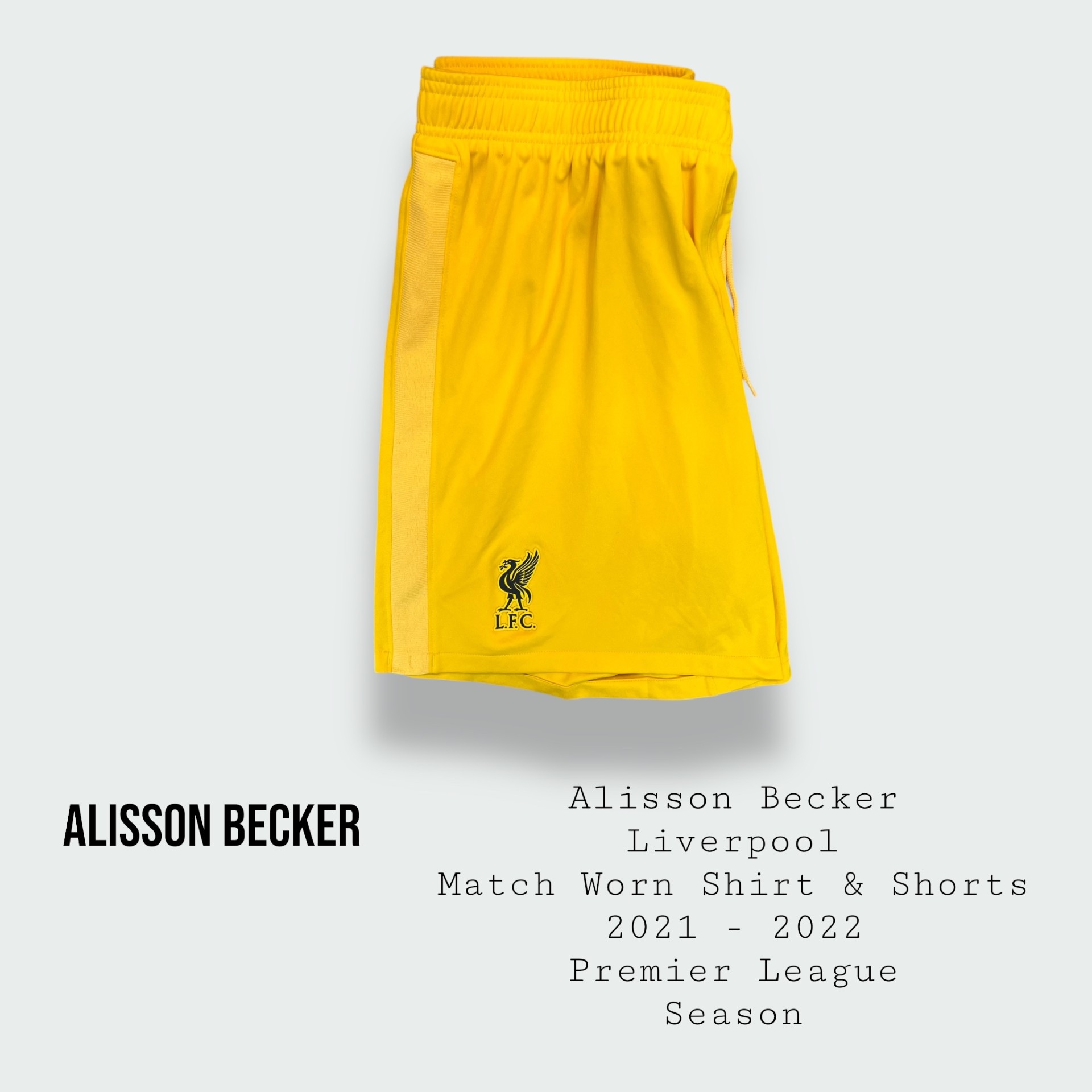 Alisson Becker Match Worn Liverpool Premier League Shirt & Shorts 2021 – 2022 Season