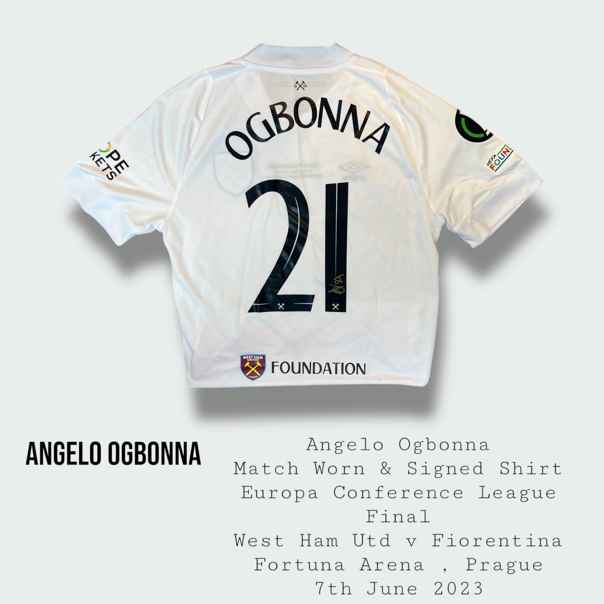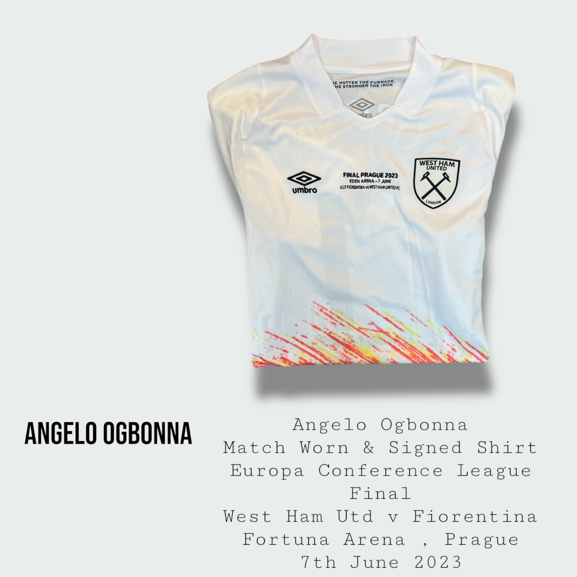Incredibly rare and historic Angelo Ogbonna match worn West Ham United Europa Conference League final shirt
