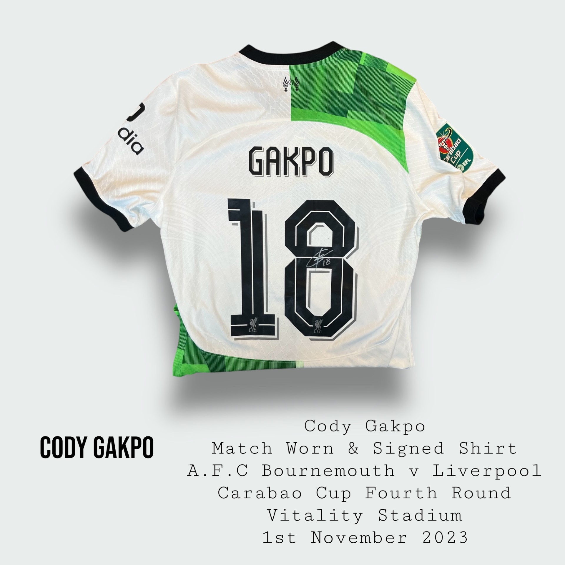 Cody Gakpo Match Worn & Signed Liverpool Carabao Cup Shirt 2023 – 2024 Season