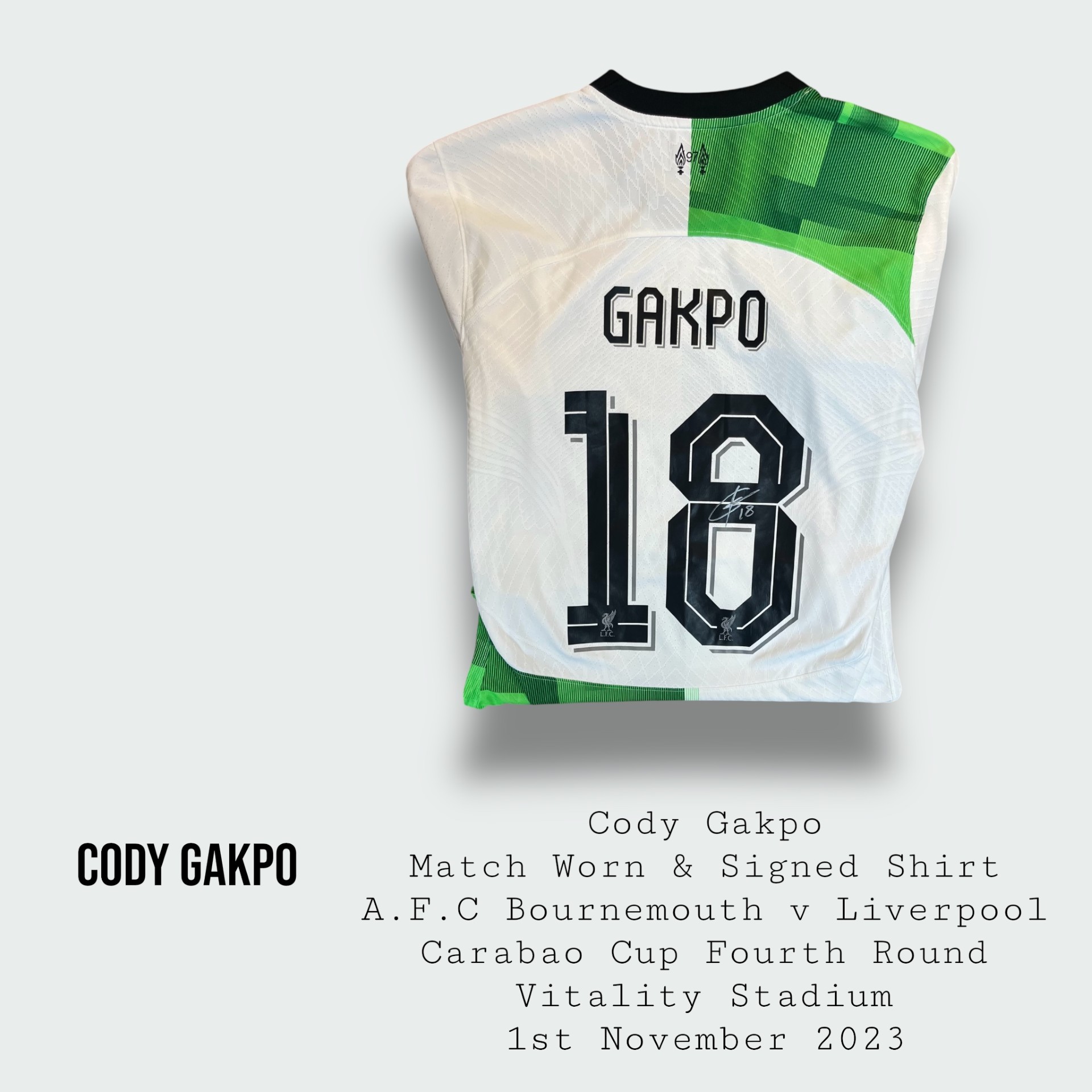 Shirt worn by Gakpo for Liverpool during the Carabao Cup fourth round fixture v A.F.C Bournemouth at the Vitality Stadium on the 1st November 2023