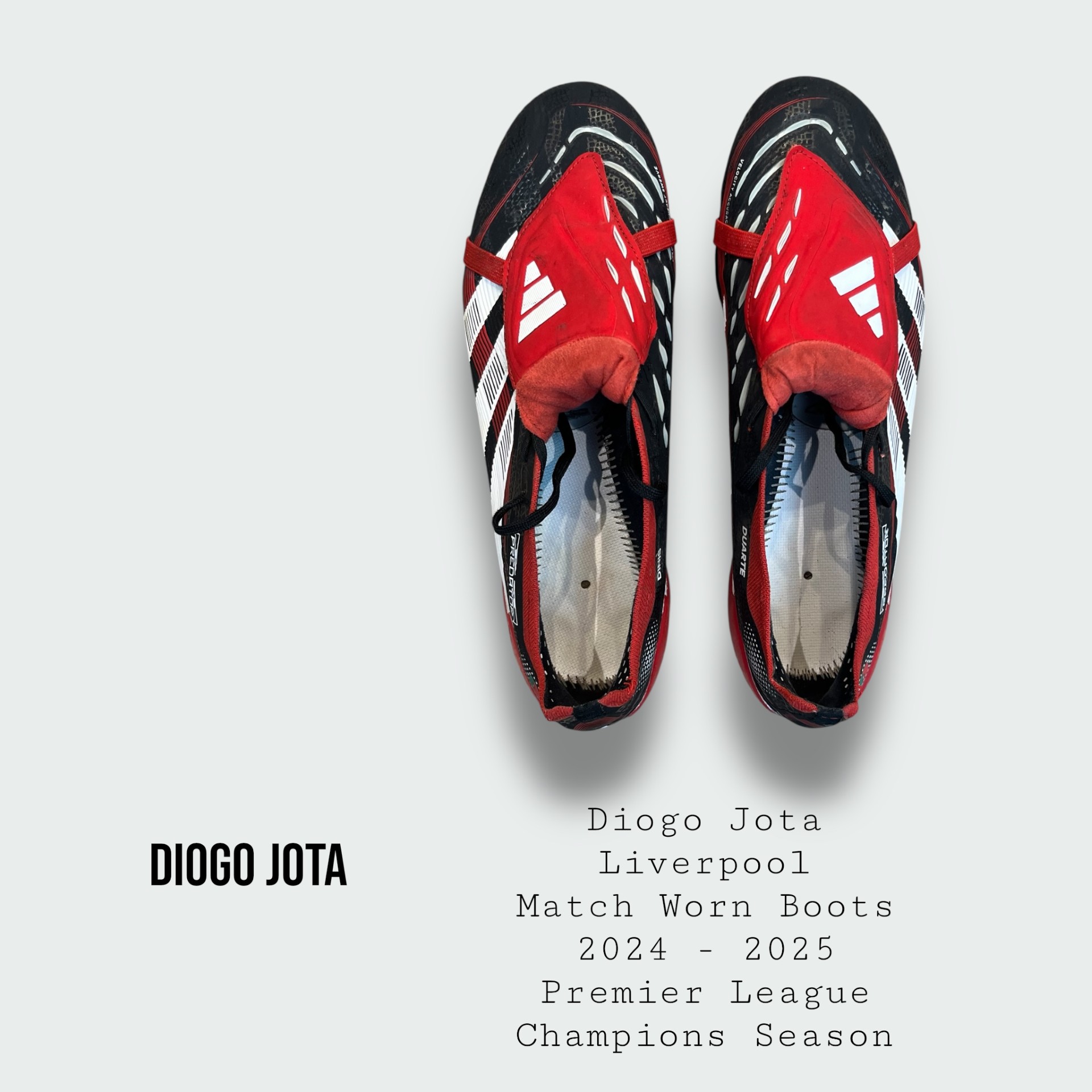 Amazing , incredibly rare and truly historic worn boots worn by the former Liverpool star and club legend who tragically lost his life on the 3rd July 2025 at the age of 28 and from his last ever season at Liverpool Football Club