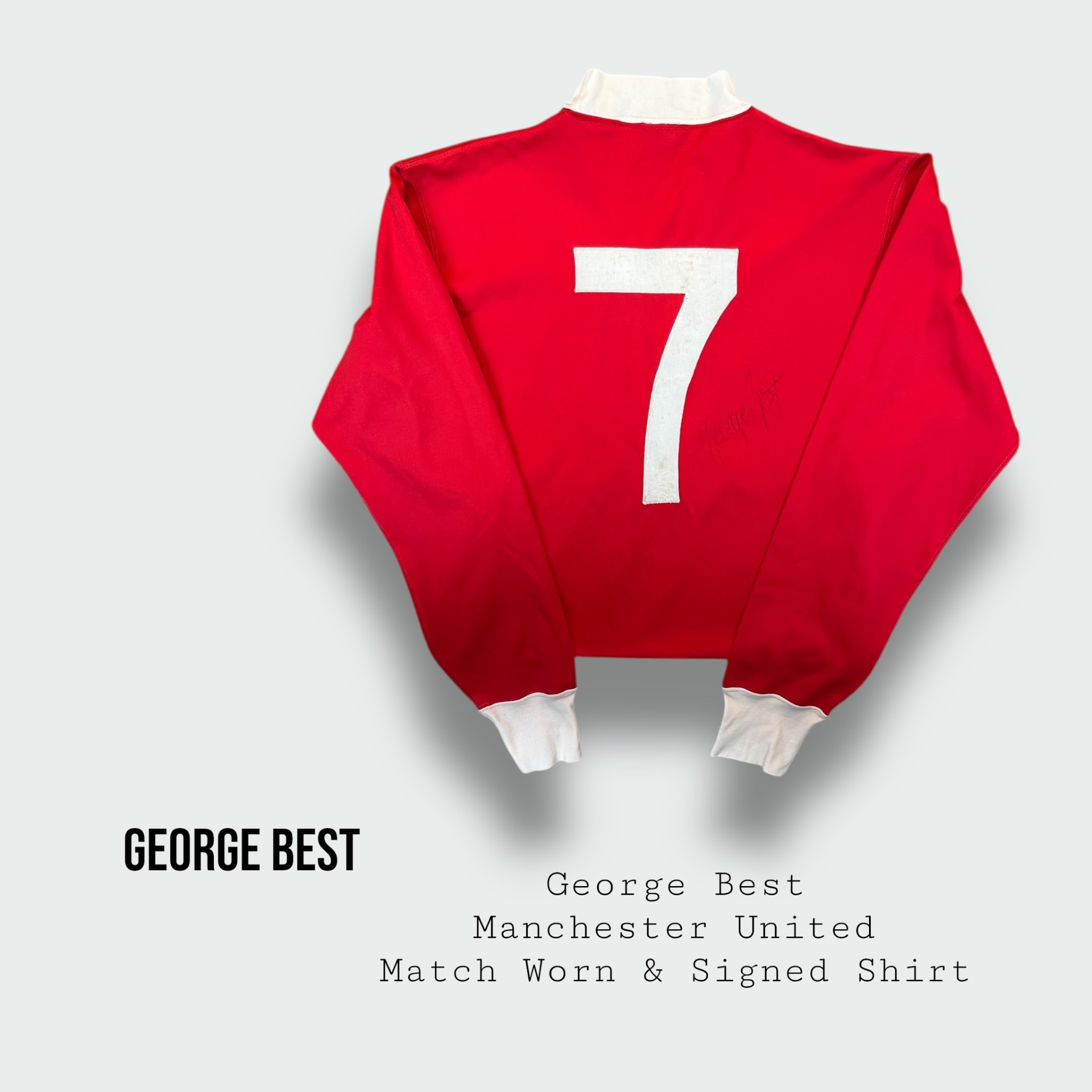 Incredibly rare and historic George Best match worn and signed Manchester United shirt