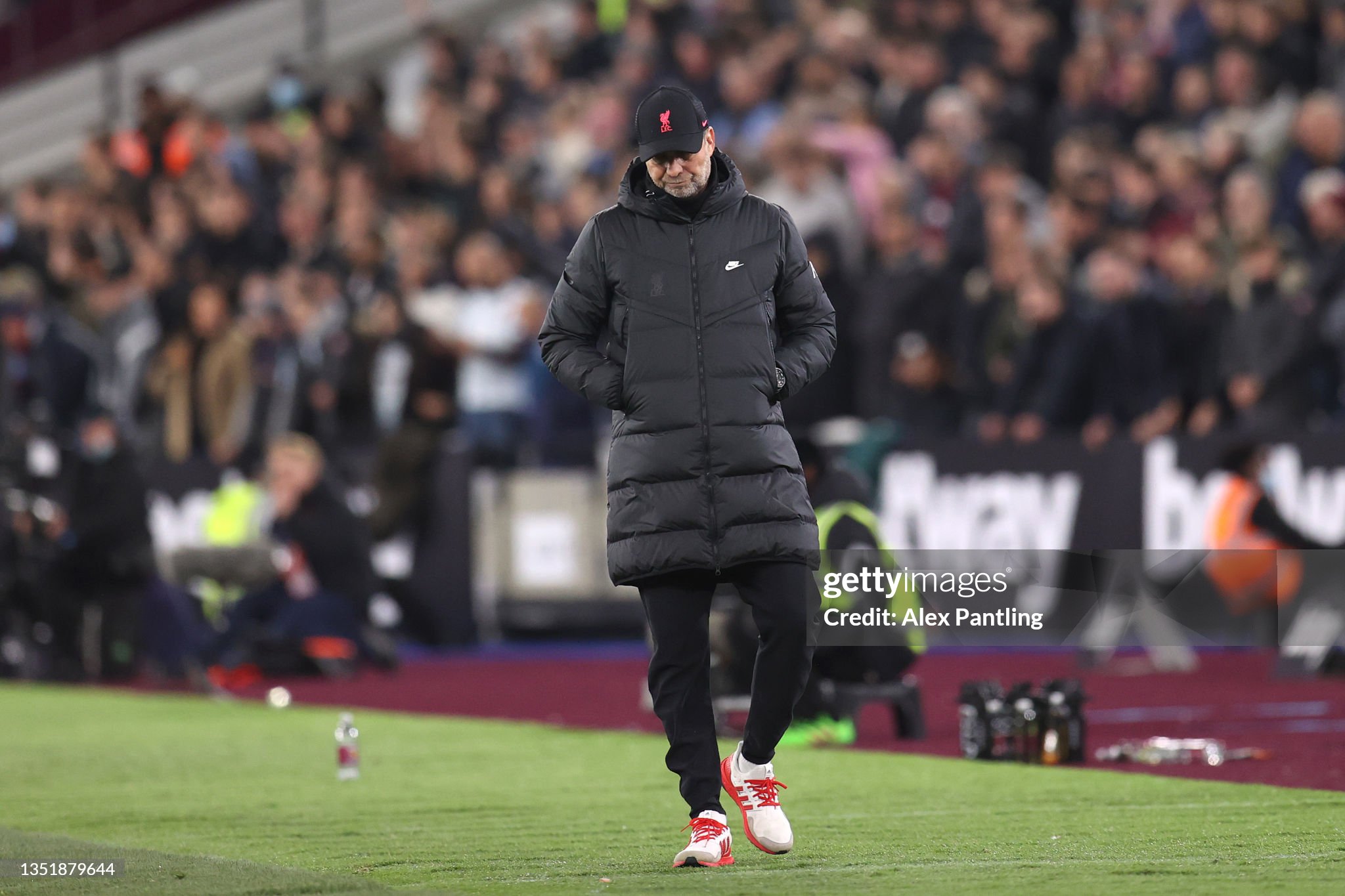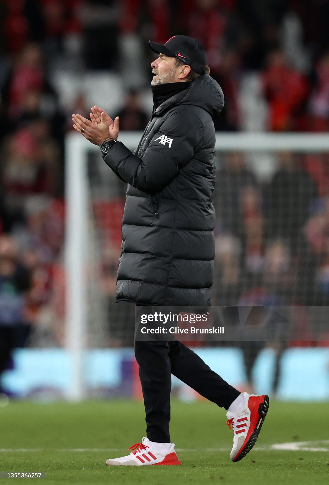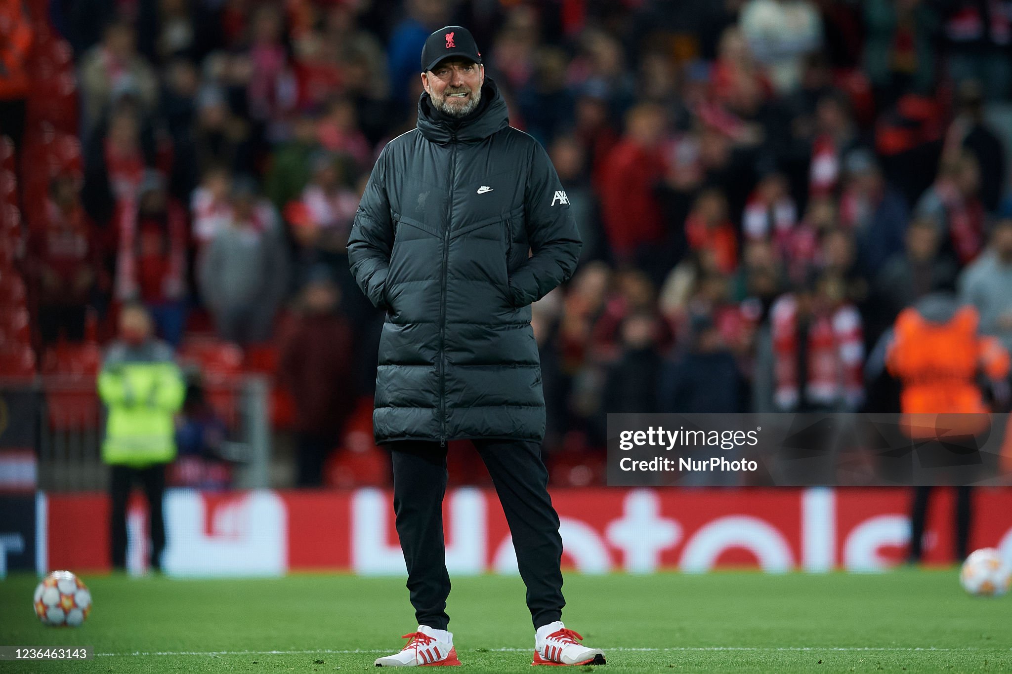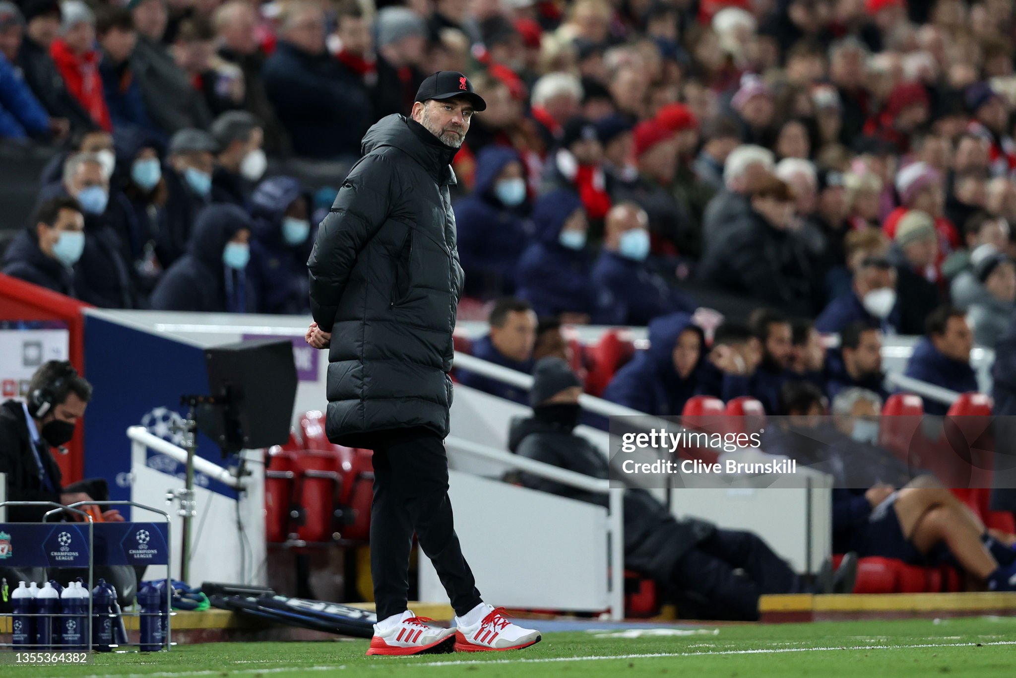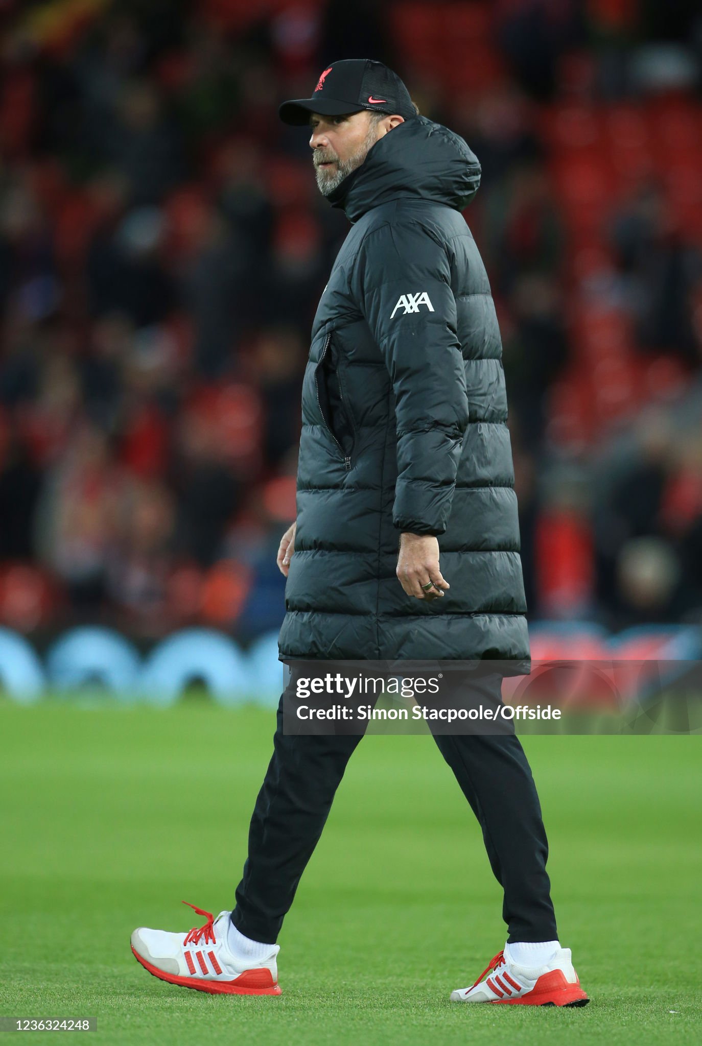 Trainers and cap worn whilst on the touchline for Liverpool during the 2021 - 2022 Premier League and Champions League season