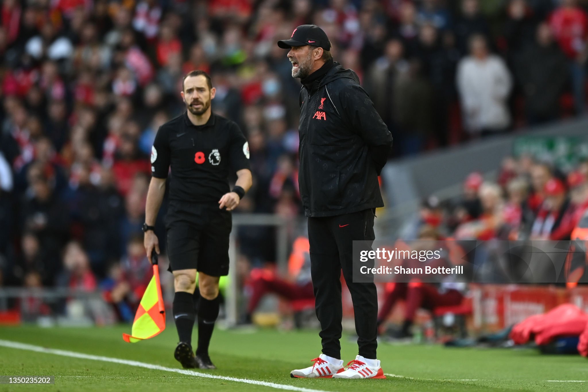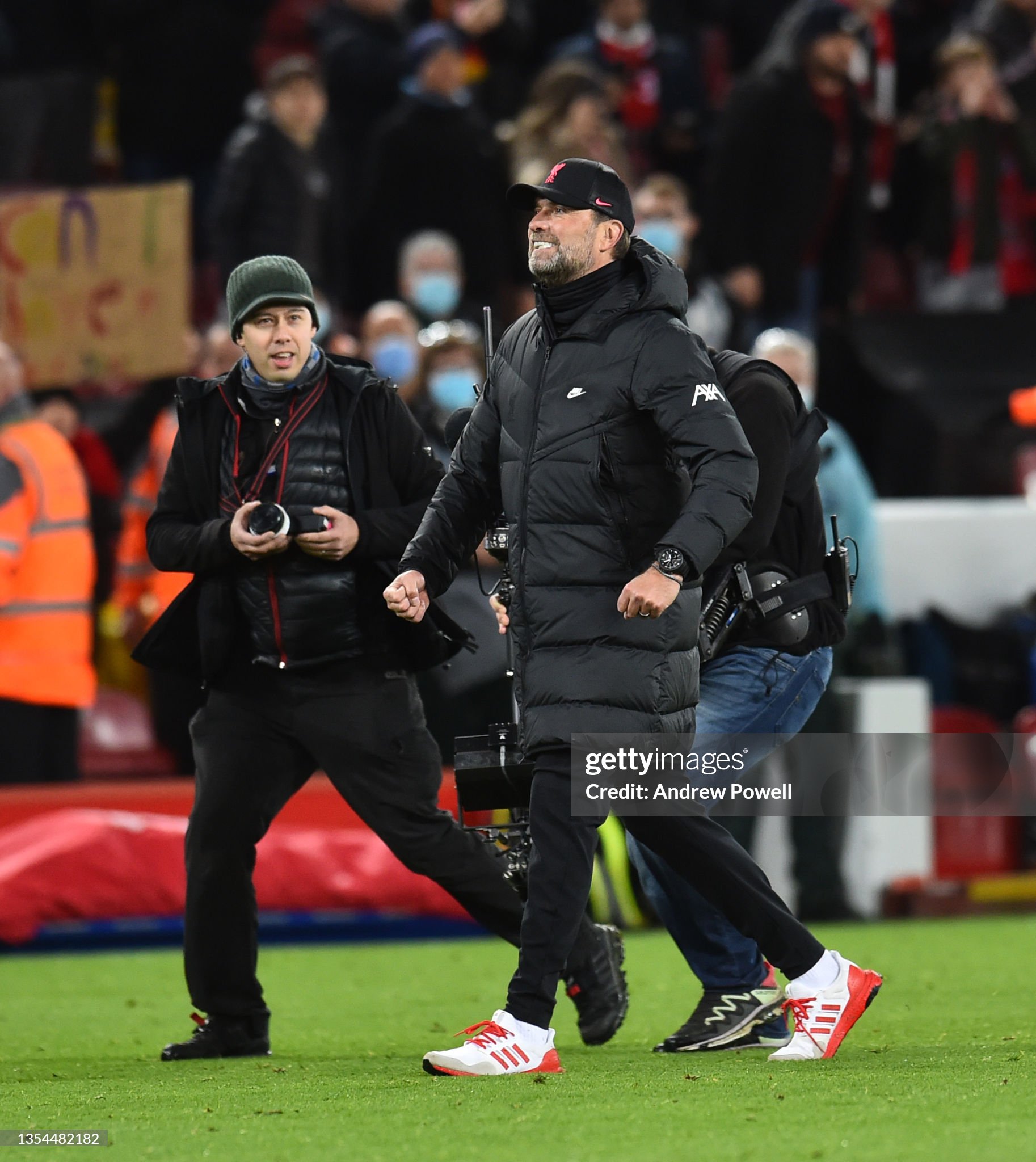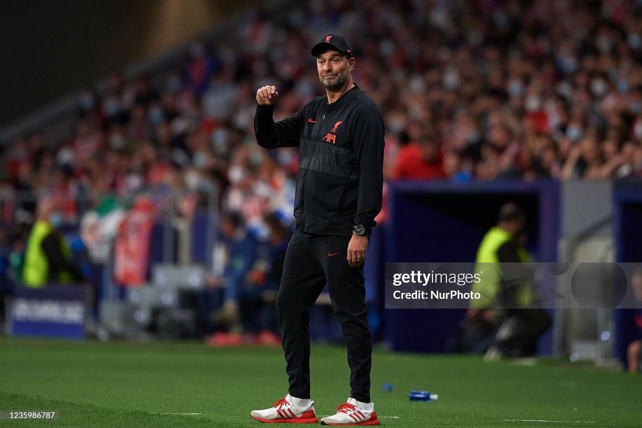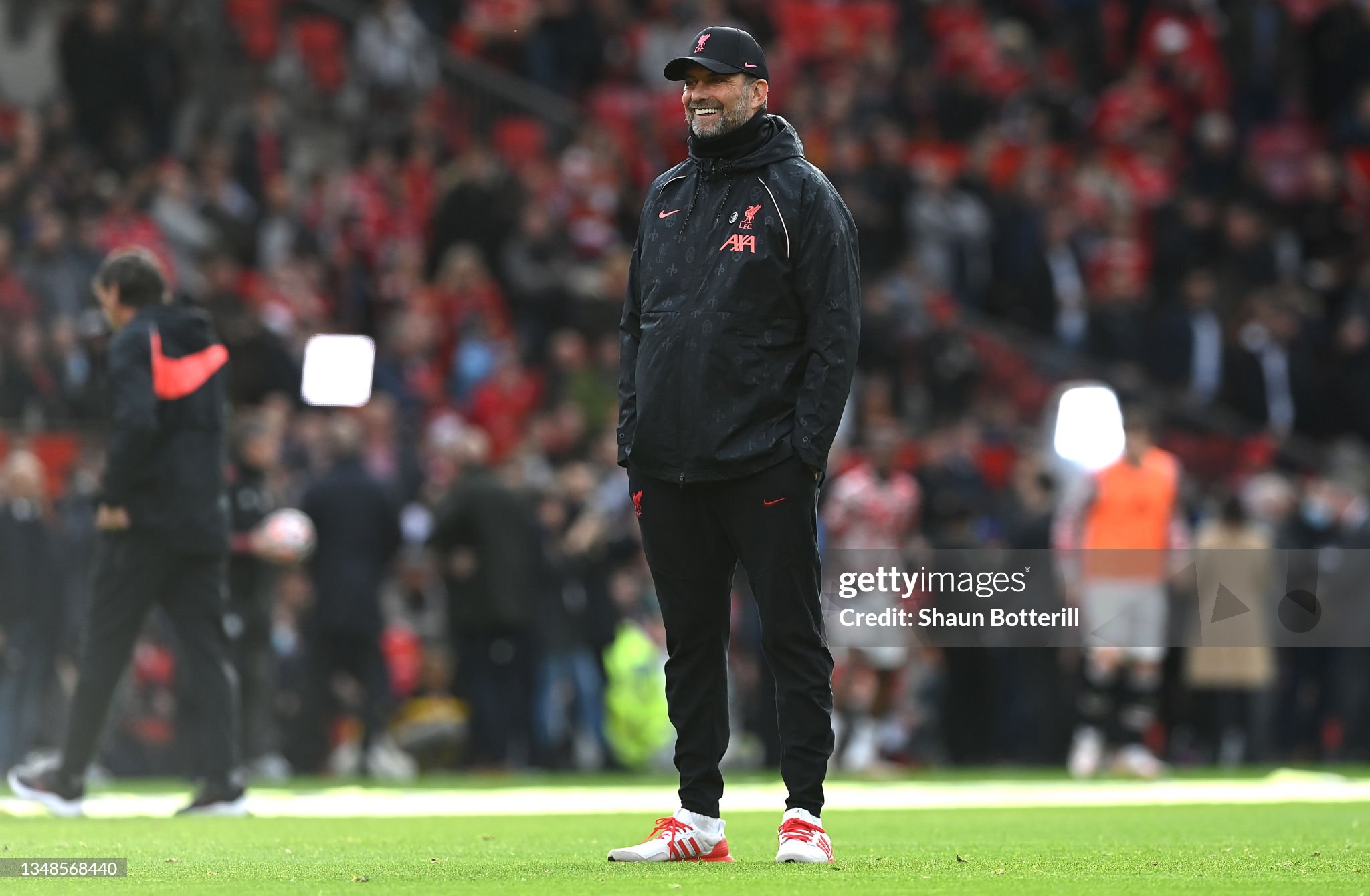 Trainers and cap worn whilst on the touchline for Liverpool during the 2021 - 2022 Premier League and Champions League season