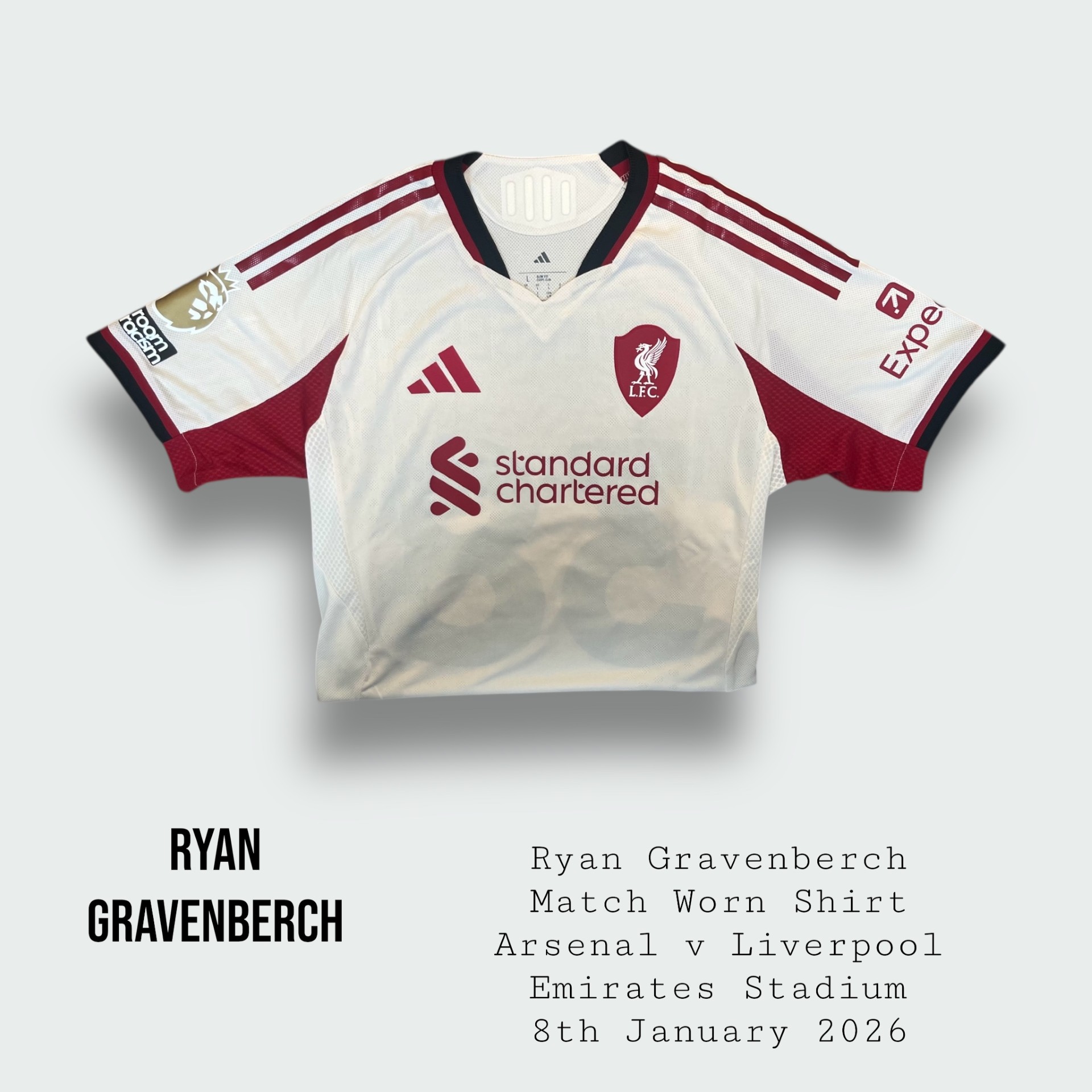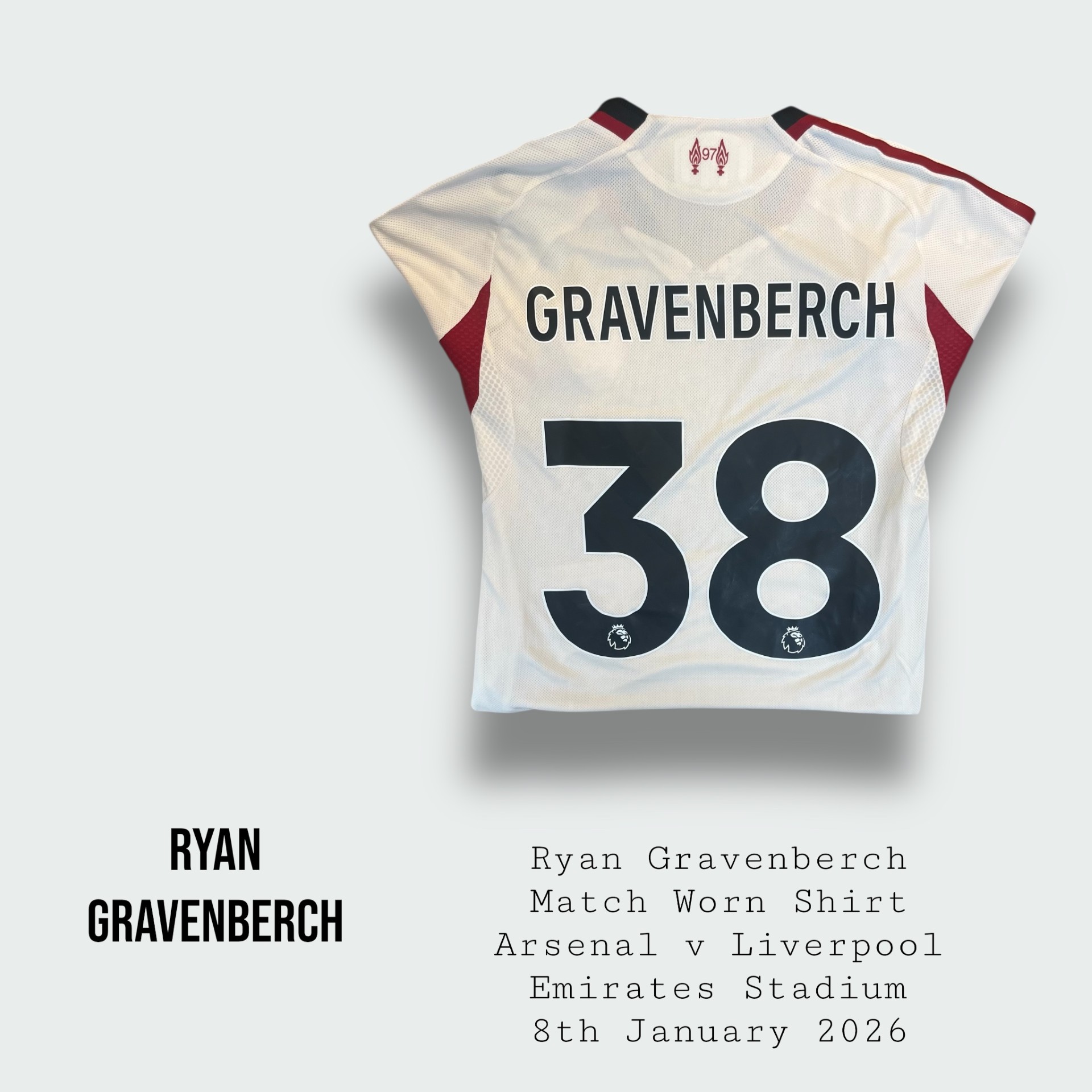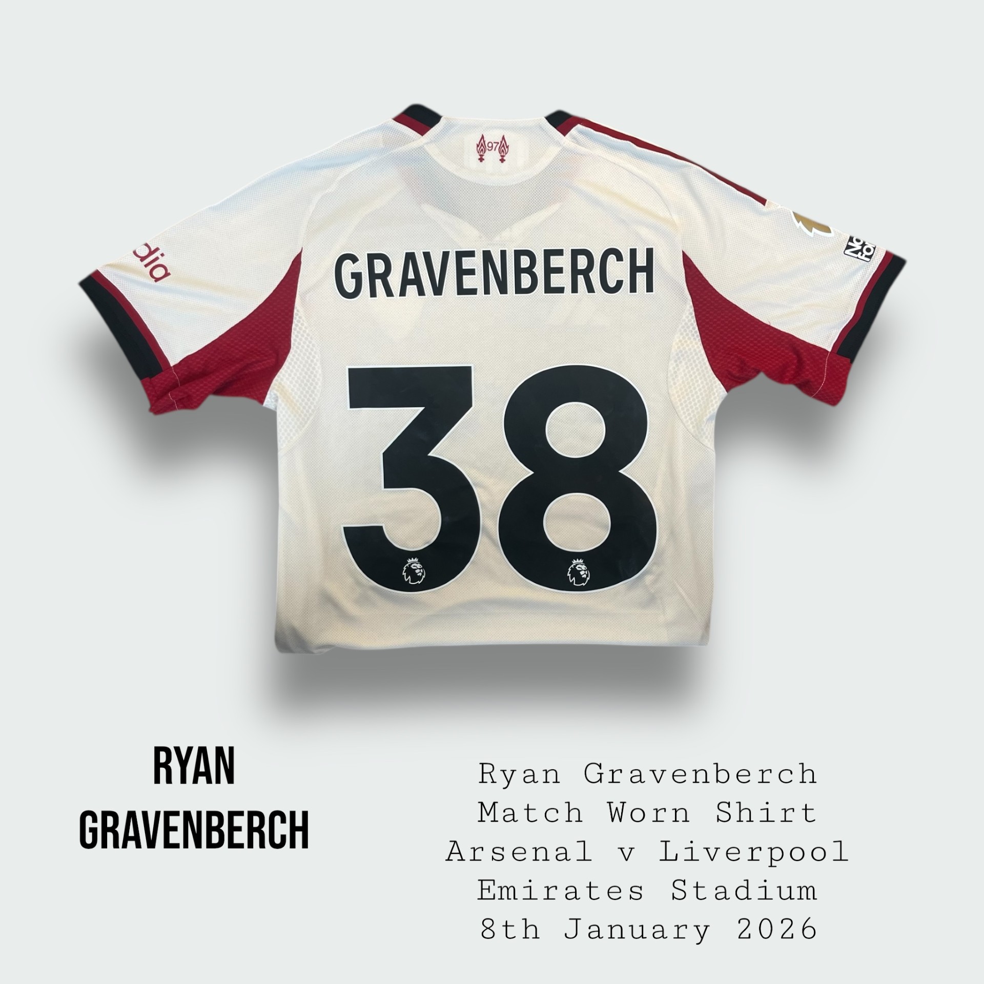 Shirt worn by Gravenberch for Liverpool during the Premier League fixture v Arsenal at the Emirates Stadium on the 8th January 2026
